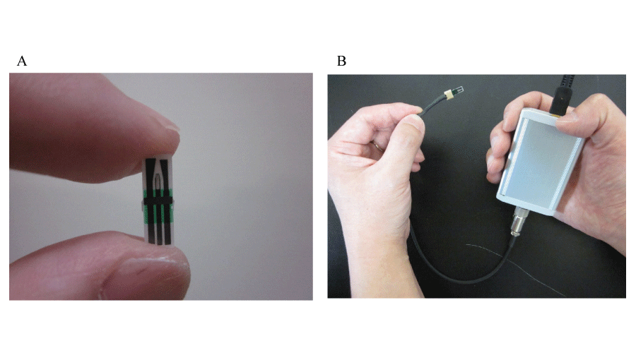 A screen-printed carbon electrode chip was used for the electrochemical measurements (Figure 1A). The carbon-based chip contained a three-electrode system that comprised a working electrode, counter electrodes, and the Ag/AgCl reference electrode [9-15]. The working electrode area was 3.04 mm2, and the total size, including the connection part and the carbon barrier that prevented solution from flowing into the chip connector, was 12.5 mm×4 mm×0.3 mm [15]. A small volume of solution (10 µL) was measured by direct application onto the electrode surface, and each chip was discarded after a single use. The screen-printed chips were affordable, and insertion of a new chip into the connector was fast and easy [9,10]. Furthermore, each chip was discarded after one measurement; therefore, cross-contamination over multiple measurements was avoided.