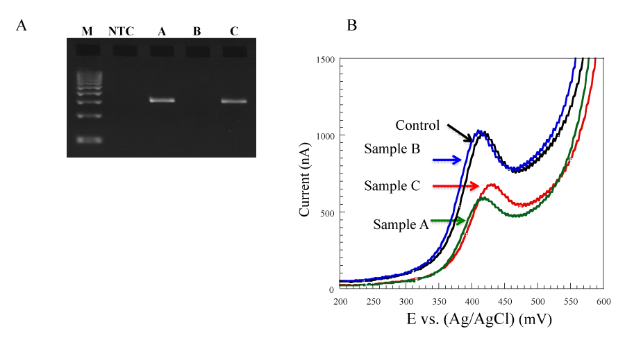 Next, we used nasal swab samples from patients to investigate the potential of this method for clinical applications. PCR and subsequent H33258-mediated electrochemical measurement were used to measure the amount of colonizing MRSA in nasal swabs taken from two patients that were being admitted into the hospital (Figure 3). Nasal swab samples A, B, and C and an NTC were subject to PCR and subsequent gel electrophoresis (Figure 3A). The specific 310-bp amplification product was clearly evident with Sample A and C, but evidently absent with NTC and Sample B.
