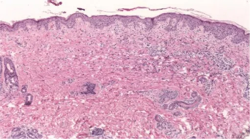 A skin biopsy reported: perivascular and interstitial vacuolar dermatitis, which is suggestive of cutaneous lupus (Figure 2). Antibodies anti-Sjögren, anticardiolipin, anti-DNA, and ANA were negative. However, anti-Ro was positive. At the same time, we ruled out the same antibodies in her mother.