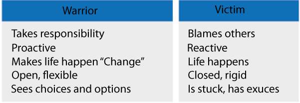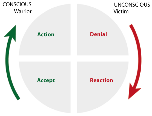 The intervention was a group intervention facilitated by an educated coach. Both groups were offered the same intervention. The framework was a three-day residential course plus six single-day/eight hour follow-up events/monthly. The total length of the intervention was 6 months. Table 1 shows the main framework for and content of the intervention. The focus of the intervention was to improve each person's coping self-efficacy in order for them to gain an improved balance in their lives (a stable mental or psychological state; emotional stability). The intervention was based primarily on a Native American philosophy of life [44] and its understanding of how changes affect human beings and create imbalance. According to this philosophy, change can be understood as a dynamic force that moves people from one point to another. However, it also acknowledges that people have different ways of facing change. The 'Wheel of Change' (Figure 1) illustrates the movement from denial over reaction to acceptance and finally to action and shows how the stages are connected to conscious and unconscious behavior. The Wheel of Change is the core starting point for the intervention. The intervention offers various tools and principles that focus on whether a person chooses 'warrior 'or 'victim' behaviors when facing challenges in his/her daily life (Figure 2). The way in which people deal with challenges determines whether, in a given situation, he or she assumes the stance of warrior or victim. The source of the warrior is love and courage while the source of the victim is fear. Once it is clear that the source of certain reactions is fear, the person becomes more conscious of how he or she reacts and is then able to develop a new ability to act. The focus of the intervention is on how to accept and recognize one's current situation and find one's own tools to act as a warrior [44].