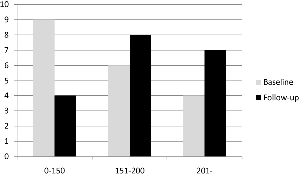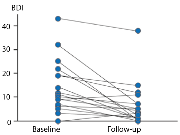 At baseline, 5 individuals had a BDI >20, indicating moderate to severe depression. At follow-up, this number decreased by 80%, and only 1 individual was depressed. The median BDI score was 11 at baseline and 4 at follow-up. A Wilcox on matched-pairs signed-rank test showed a significant decrease in depression from baseline to follow-up (p=0·0017; Figure 3). A total of 53% of the individuals had diagnosable depression at some point in their lives. The median BDI scores both at baseline and at follow-up fell into the lower range (0–13), indicating minimal depression. Looking at the interquartile ranges, the upper quartile was 19 at baseline and 9 at follow-up. Five individuals had moderate to severe depression at baseline, while only one had moderate to severe depression at the follow-up.